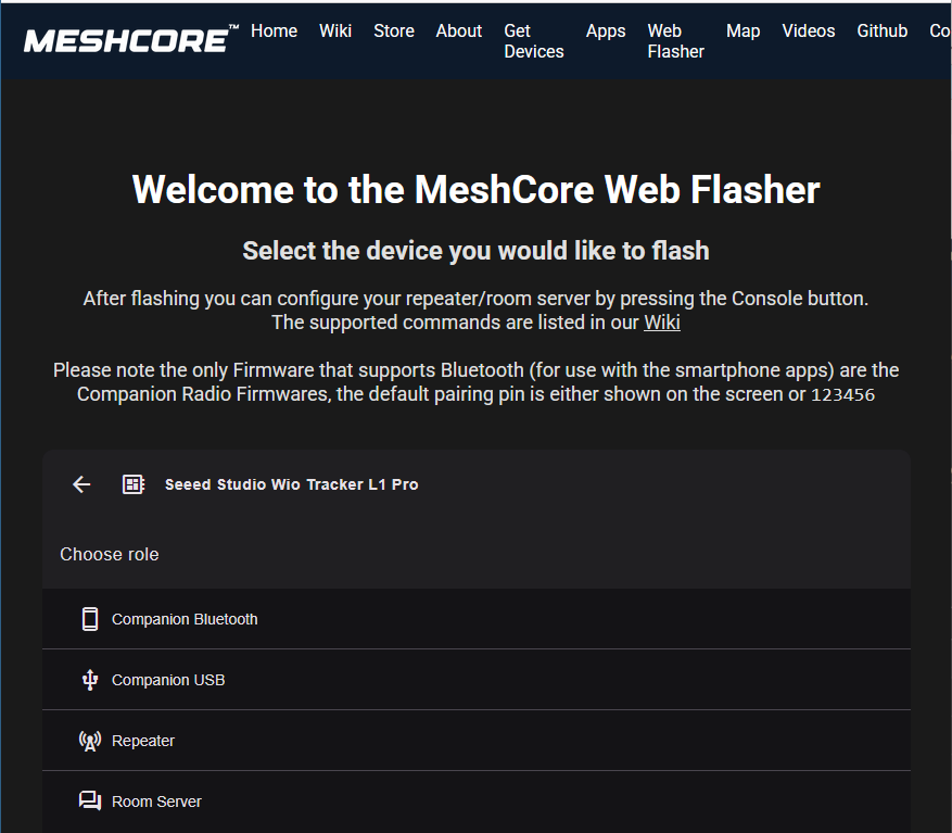 Nach Anklicken des zu installierenden Funkgeräts wird man gefragt, welchen Typ von Firmware bzw. welche Funktion man installieren möchte: "Companion", "Repeater" oder "Room Server" (siehe Abb. 15). Typischerweise möchte man das Funkgerät über die Handy-App, gekoppelt per Bluetooth nutzen, weshalb man dann "Companion Bluetooth" anklickt.